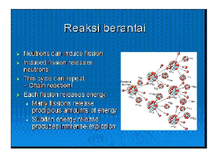 Reaksi Berantai Tak Terkendali Reaksi berantai tak terkendali dapat menghasilkan energi yang sangat besar. Untuk satu pembelahan inti rata-rata energi yang dibebaskan 208 Me. V. Reaksi berantai tak terkendali terjadi ketika neutron yang dihasilkan (rata-rata 2, 5 neutron) dari setiap pembelahan inti menumbuk inti lain dan proses ini berlanggsung terus -menerus, energi yang terlepas akan terjadi sangat cepat sehingga terjadi ledakan (seperti dalam bom atomik).