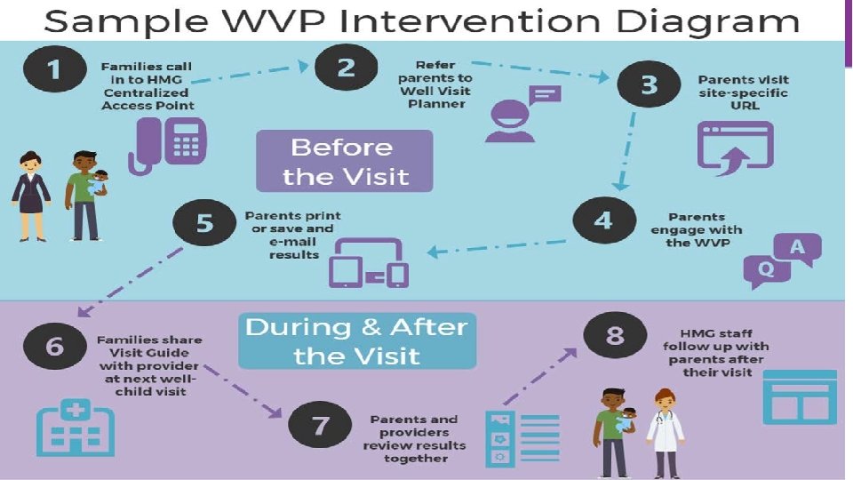 Evaluation Process Impact Outcome • • Referral Form Family Participation Tracker Engagement in COP Feasibility • Family Participation Tracker • Degree of adoption • Satisfaction • Follow-up with families • Linkages from families use of WVP to well-child visit • Sustainability