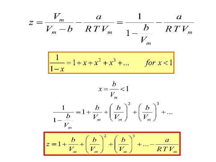 Many other equations of state Mostly empirical Virial Equation to correct, develop in a series (additional correction terms: B, C, …: second, third, … virial coefficients: exp. determined