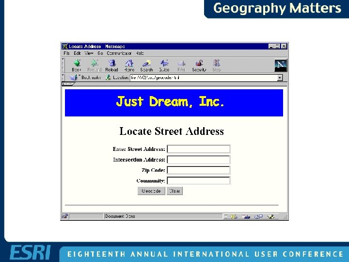 Geocoding SDE Pseudo Code SE_connection_create(&connection, host, instance, user, password); SE_shape_create( NULL, &shape); SE_stream_create( &connection, &stream); CHAR * col[] = { “SHAPE”, “FADDR”, “TADDR”, “PREFIX”, “NAME”, ”TYPE”, ”SUFFIX”, ”LZIP”}; CHAR * tab[] = { “STREETS”}; SE_SQL_CONSTRUCT sql. Construct; sql. Construct. num_tables = 1; sql. Construct. tables = tab; sql. Contruct. where = “PREFIX=‘W’ AND NAME=‘MAIN’ AND TYPE=‘ST’ AND ZIPL=92373” “ AND FADDR<=123 AND 123<= TADDR”; SE_stream_query( stream, 8, col, &sql. Construct); SE_bind_output_column( stream, 1, shape, &ind); SE_bind_output_column( stream, 2, faddr, &ind); …. SE_stream_execute( stream); while( (se=SE_stream_fetch( stream)) == SE_SUCCESS){ calc. Location( shape, faddr, taddr); } SE_stream_close( stream); SE_stream_free( stream); SE_connection_close( connection);