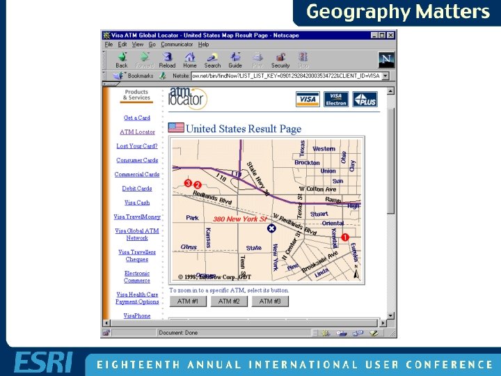 1 2 WWW. VISA. COM CGI/SERVLET 8 7 3 Business Logic IMS CORE GEOCODER 6 Web Server PROXIMITY SDE 4 Server Broker MAPPER Data Repository 5 Data Access
