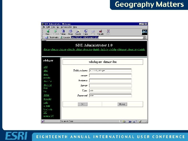 SDE HTML Requirements • Java. Script Enabled Web Browser. • Servlet Enabled Web Server. – CGI version also available • SDE 3. x Version. • Downloaded *. html, *. class files.