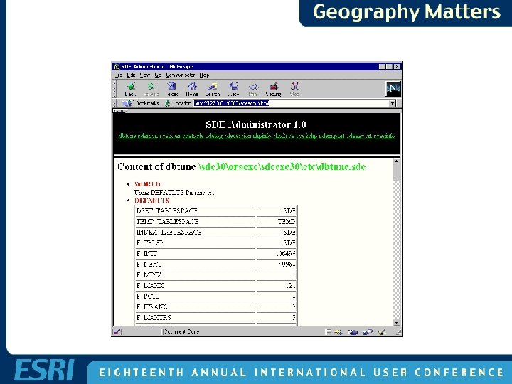 SDE HTML Admin WEB Server Dbtune Servlet Sdeexec Servlet ##WORLD END ##DEFAULTS DSET_TABLESPACE SDE TEMP_TABLESPACE TEMP INDEX_TABLESPACE SDE F_TBLSP SDE F_INIT 106496 F_NEXT 40960 F_MINX 1 F_MAXX 121 F_PCTI 0 F_ITRANS 2 SDE Admin Command sdemon sdelayer ….