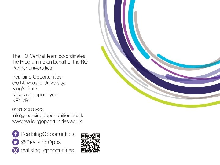 Impact RO evaluation framework designed to: • Understand/ensure benefits to students through assessing changes in student attitudes, awareness and knowledge. • Evidence the impact of the programme through progression to Research Intensive Universities. Impact highlights • Over 5, 000 “most able, least likely” students have taken part in RO so far. • 64% of RO students have entered higher education, compared to 38% of young people nationally. • A higher proportion of RO students progress to research intensive universities than the national average proportion of state school students who progress to the most selective HEIs. • 77% of RO students tracked to their degree completion achieved a 1 st or 2: 1 in their degrees compared to 66% of all students nationally. • 94% of students tracked were in work or study after graduation compared to 90% nationally.
