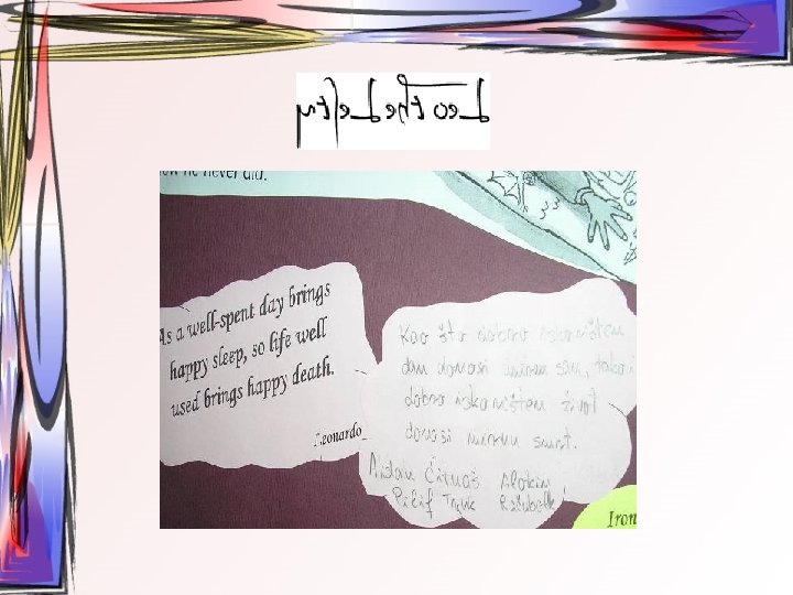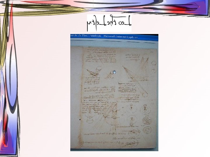 7. Razred - engleski jezik- “Leo the Lefty” • Cjelina: “Up, up, higher and higher“ (Udžbenik Way to go 4), na str. 39 tekst o Leonardu da Vinciju – izumitelju • otvaranjem stranice http: //www. bl. uk/onlinegallery/ttpbooks. html) opcijom “Turning pages” virtualno smo pregledali Leonardov dnevnik • na stranici http: //www. mos. org/sln/Leonardo/ učenici su se i sami mogli poigrati pisanja poput Leonarda
