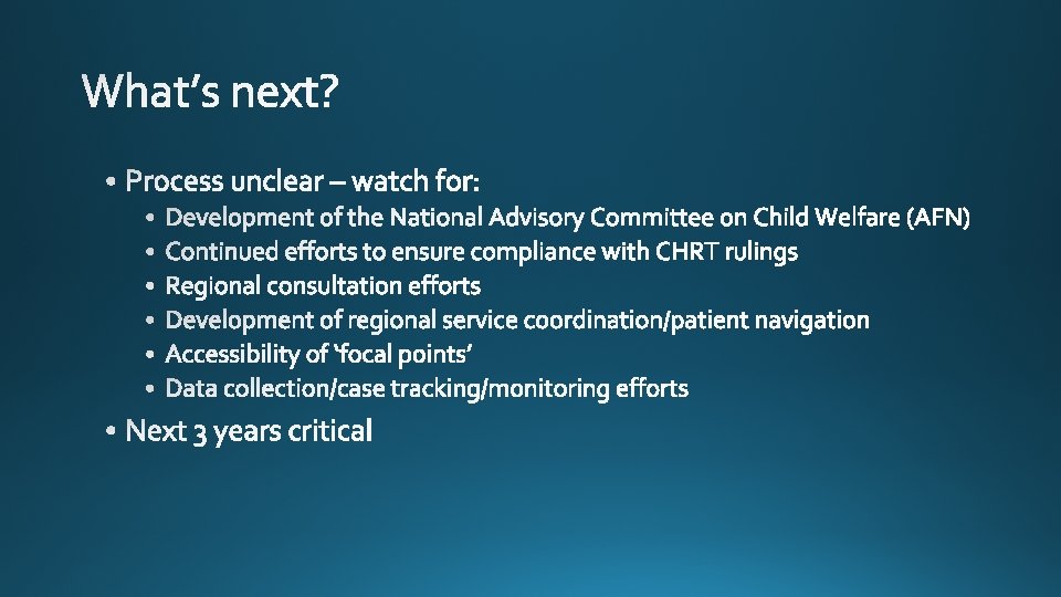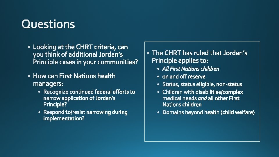 Jordan’s Principle Originated 2005 Unanimous support in house of commons 2007 Wen-de report Federal statements -no Jordan’s Principle cases in Canada Development of bi/tripartite agreements CHRT rules federal government must implement Jordan’s Principle (2016) Federal ruling in PLBC v. Canada Ongoing CHRT monitoring of short term remedy compliance 3 year period for development of long-term remedy (20162019)