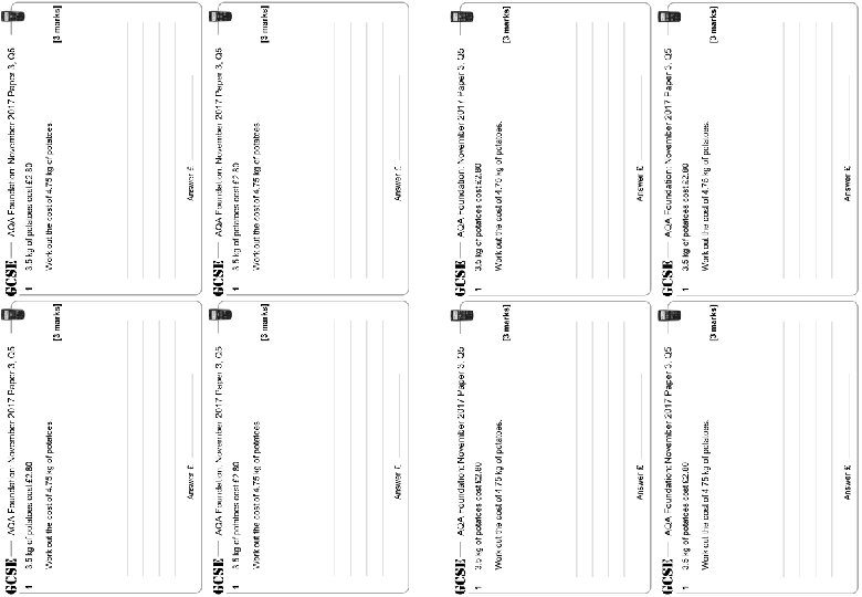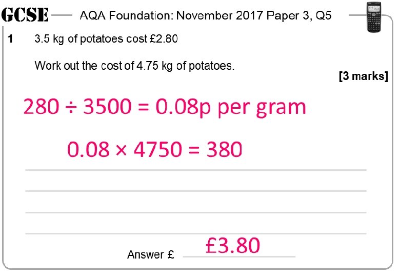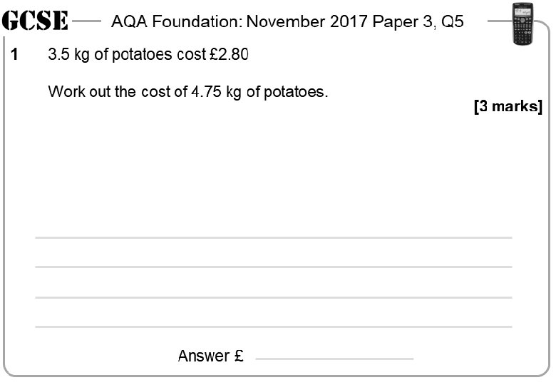 AQA Foundation: November 2017 Paper 3, Q 5 1 3. 5 kg of potatoes cost £ 2. 80 Work out the cost of 4. 75 kg of potatoes. [3 marks] Answer £ AQA Foundation: November 2017 Paper 3, Q 5 1 3. 5 kg of potatoes cost £ 2. 80 Work out the cost of 4. 75 kg of potatoes. Answer £ [3 marks] Answer £ AQA Foundation: November 2017 Paper 3, Q 5 1 3. 5 kg of potatoes cost £ 2. 80 [3 marks] 3. 5 kg of potatoes cost £ 2. 80 Work out the cost of 4. 75 kg of potatoes. Answer £ [3 marks]