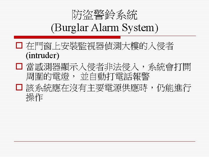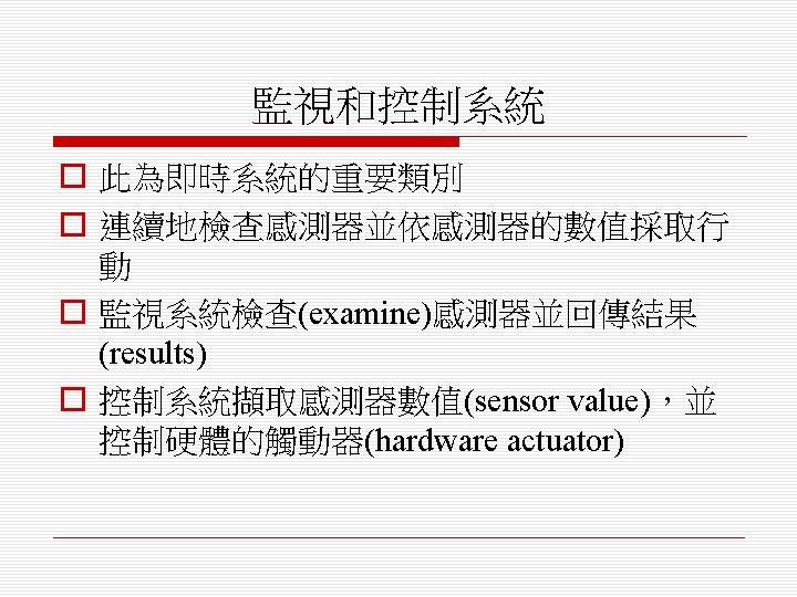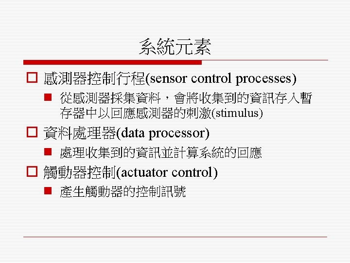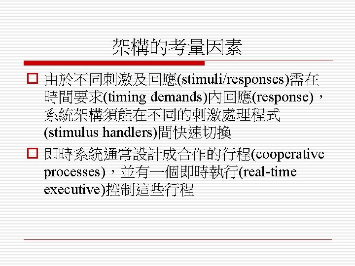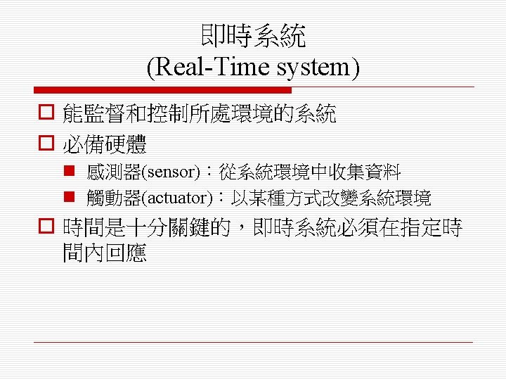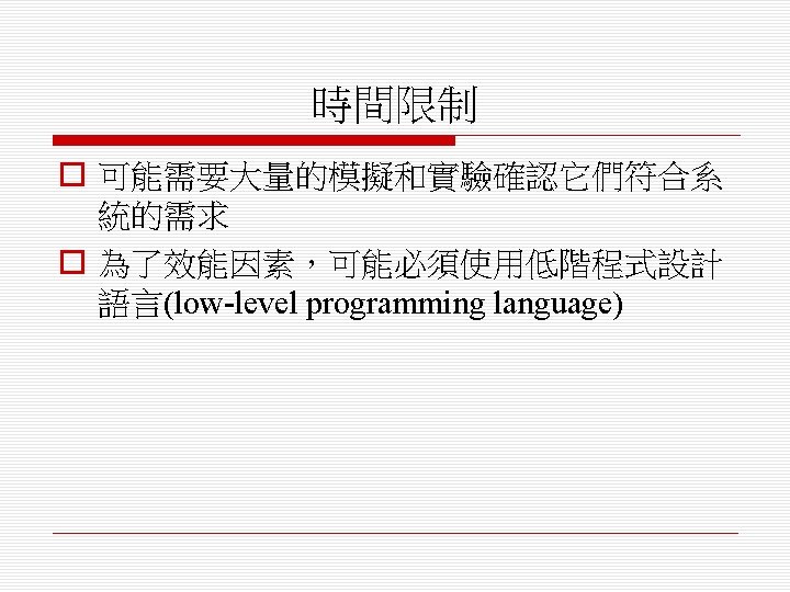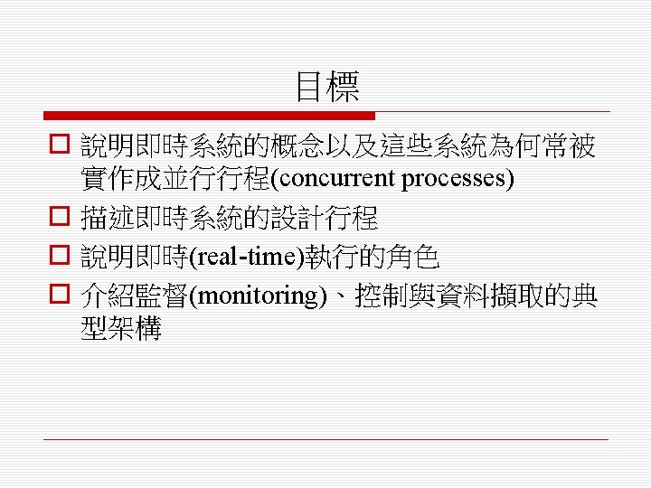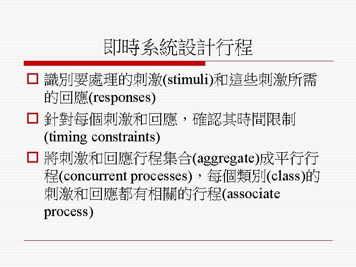 即時軟體設計 (Real-Time Software Design) o 設計嵌入式軟體系統,其行為是受時間限 制(timing constraints)