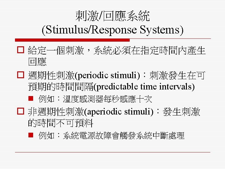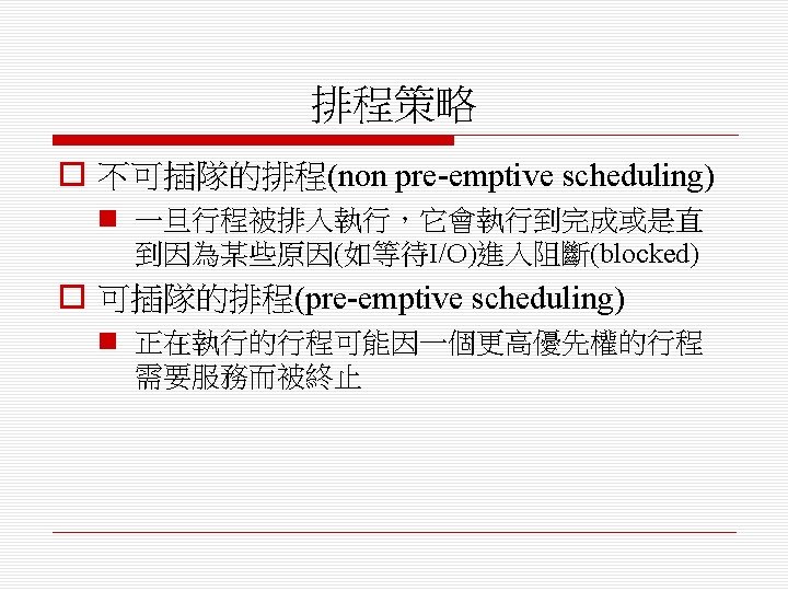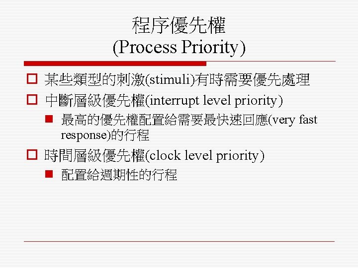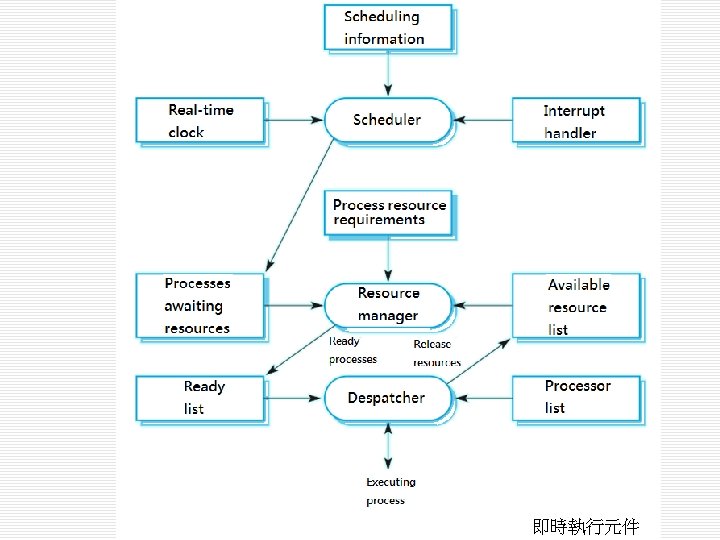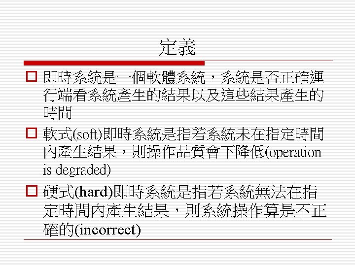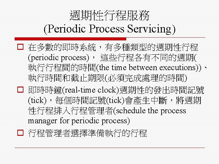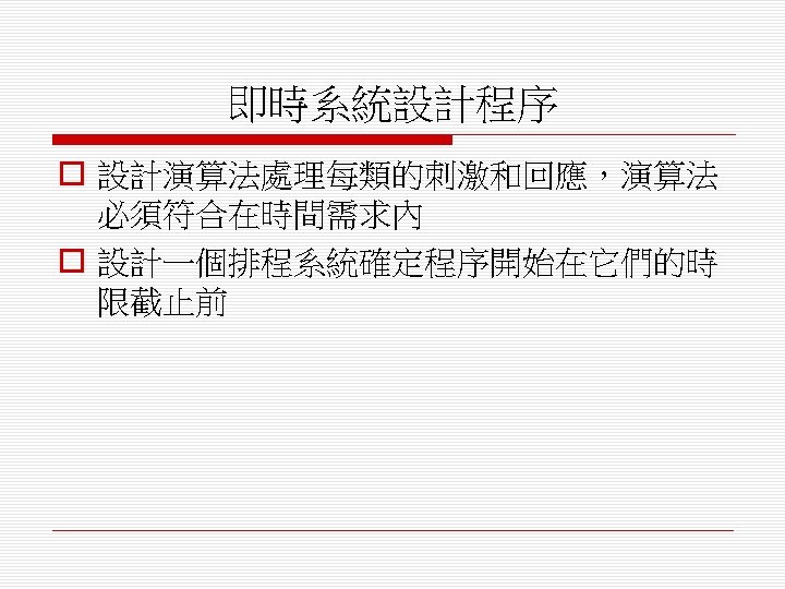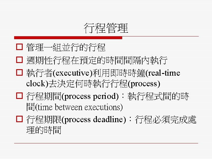 o 排程演算法(scheduling algorithm) n 循環式排程(round-robin) n 單調速率排程(rate monotonic) n 最短截止時限優先排程(shortest deadline first)