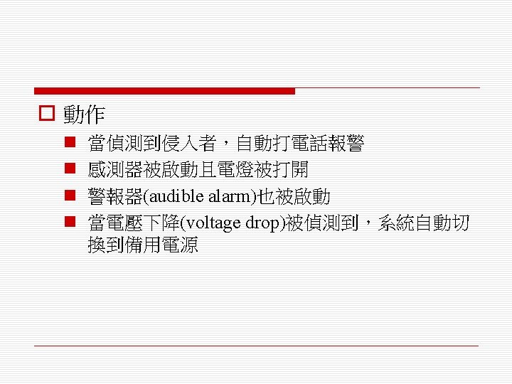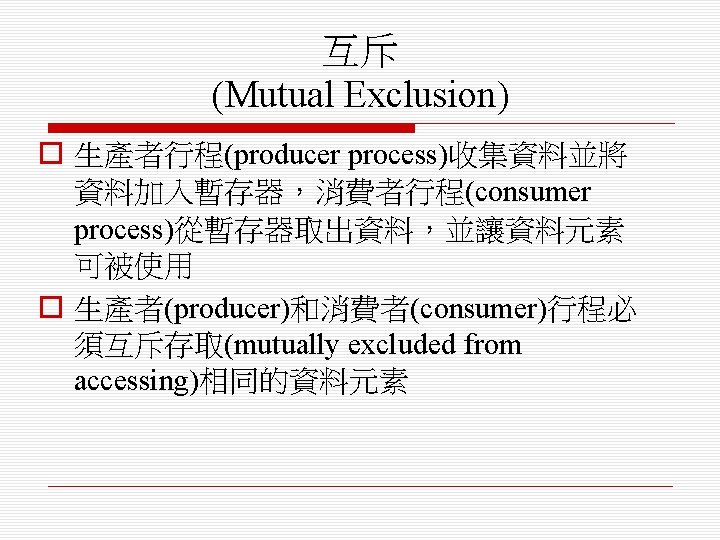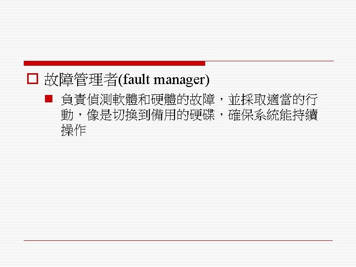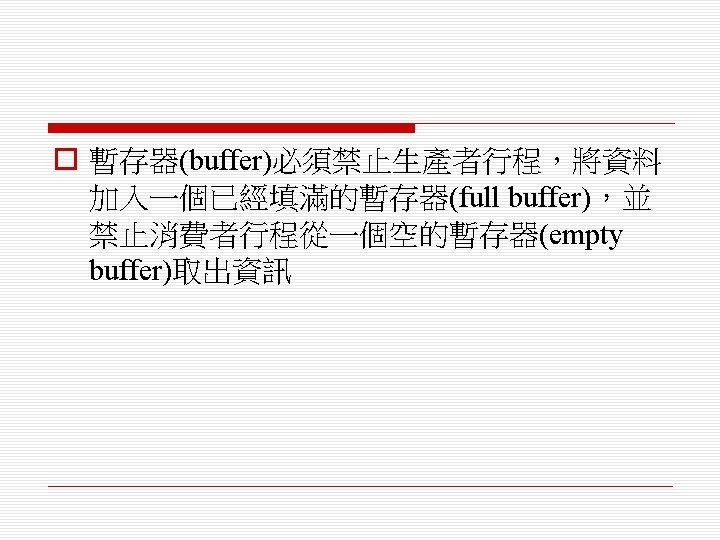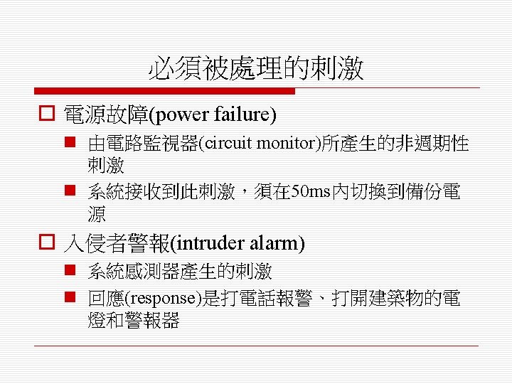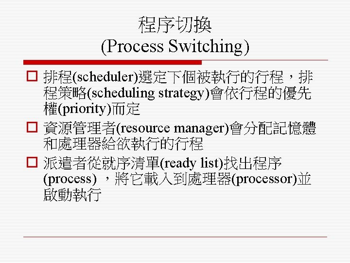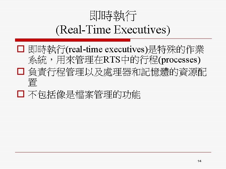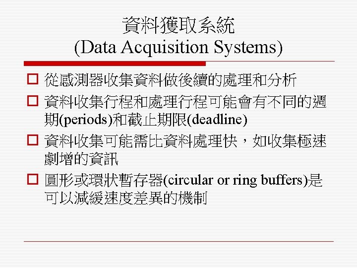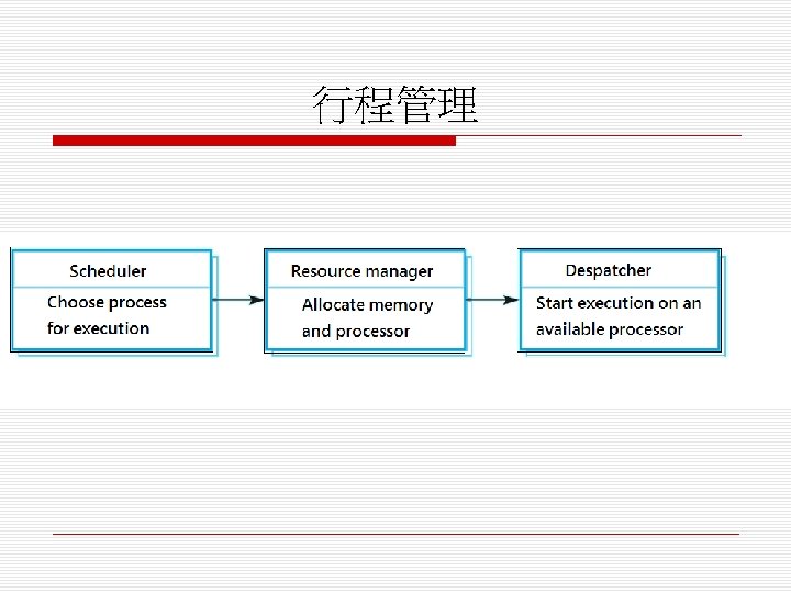 o 排程演算法(scheduling algorithm) n 循環式排程(round-robin) n 單調速率排程(rate monotonic) n 最短截止時限優先排程(shortest deadline first)