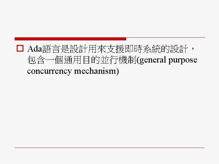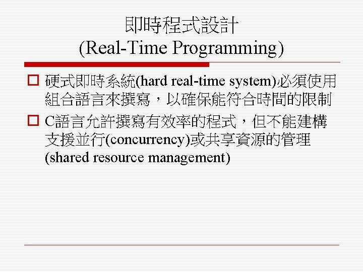 Java當作即時系統的語言 o Java支援輕量型並行執行(lightweight concurrency) (緒及同步化方法(thread and synchronized methods)),它們可以用在一些軟 式即時系統(soft real-time system)