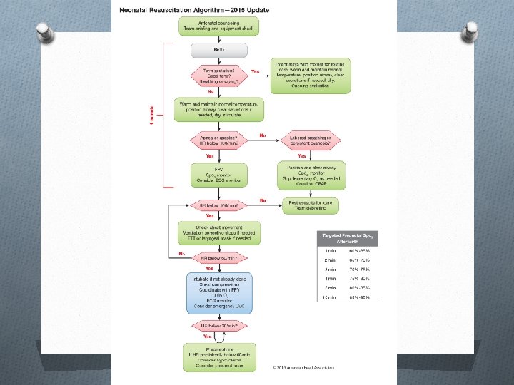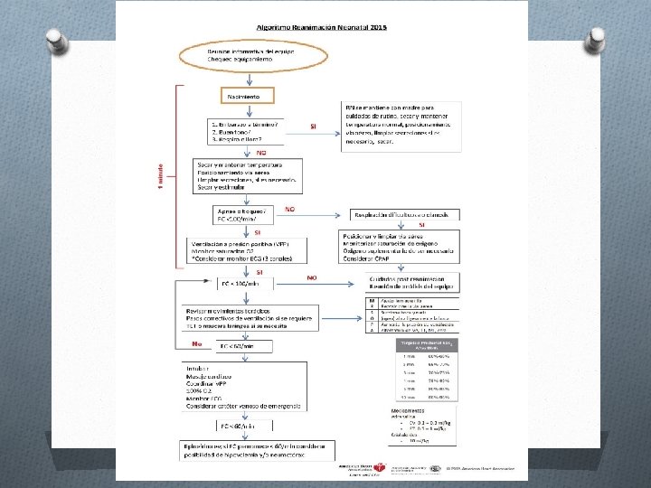 Recomendaciones 2015 O El orden de las 3 preguntas de evaluación ha cambiado a 1) ¿Gestación a término? ; 2) ¿Buen tono? ; y 3) ¿Respira o llora? O Se mantiene la marca del “minuto de oro” evitar un retraso innecesario del inicio de la ventilación O Pinzamiento del cordón umbilical O Se asocia con menos hemorragia intraventricular, presión arterial y volumen sanguíneo más altos, menor necesidad de transfusión tras el nacimiento y menos enterocolitis necrotizante.
