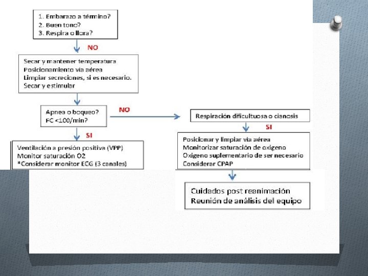 O Prematuro: probabilidad mas alta de reanimación y mayores factores de riesgo. O Tono: RN hipotónico mayor probabilidad de reanimación. O Respira o llora: no confundir con boqueo.