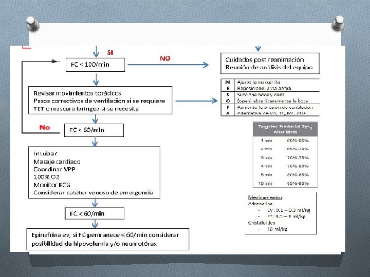O Respiracion inicial: O Insuflacion/aireacion pulmonar. O Respuesta en FC O No realizar soporte cirulatorio sin confirmar ventilacion pulmonar adecuada. O Aire/oxigeno: O RNT: iniciar VPP Fi. O 2 21% O RNPT < 35 sem: concentraciones bajas, 21 30% O Saturacion O 2 preductal en percentil 25.