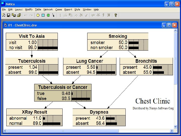 Two software tools • Netica: Windows app for working with Bayesian belief networks and influence diagrams – A commercial product but free for small networks – Includes a graphical editor, compiler, inference engine, etc. • Samiam: Java system for modeling and reasoning with Bayesian networks – Includes a GUI and reasoning engine