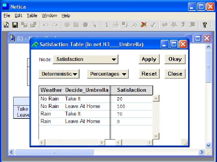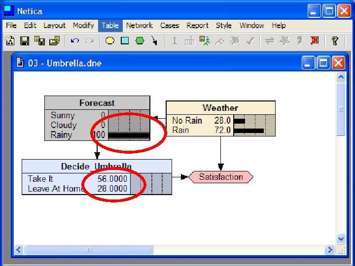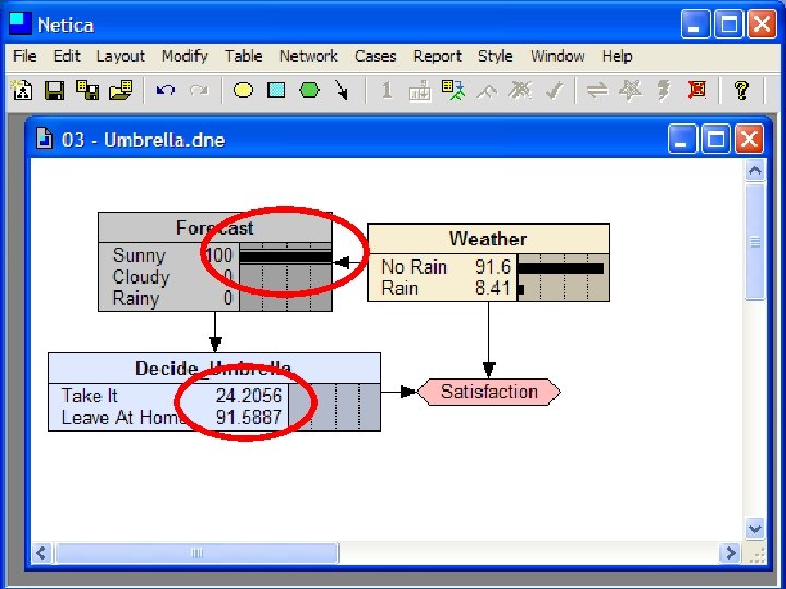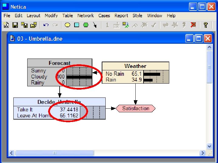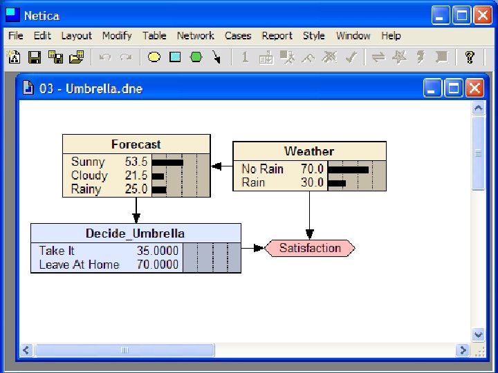Decision Making with BBNs • Today’s weather forecast might be either sunny, cloudy or rainy • Should you take an umbrella when you leave? • Your decision depends only on the forecast – The forecast “depends on” the actual weather • Your satisfaction depends on your decision and the weather – Assign a utility to each of four situations: (rain|no rain) x (umbrella, no umbrella)