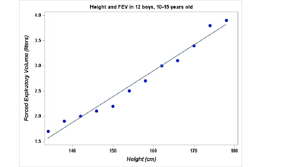 title "Height and FEV in 12 boys, 10 -15 years old"; data fev 1 ht; input height fev @@; label fev="Forced Expiratory Volume (liters)" height="Height (cm)"; datalines; 134 1. 7 158 2. 7 138 1. 9 162 3. 0 150 2. 2 142 2. 0 166 3. 1 146 2. 1 170 3. 4 154 2. 5 ; proc sql; select * from fev 1 ht order by height ; quit; title; 174 3. 8 178 3. 9
