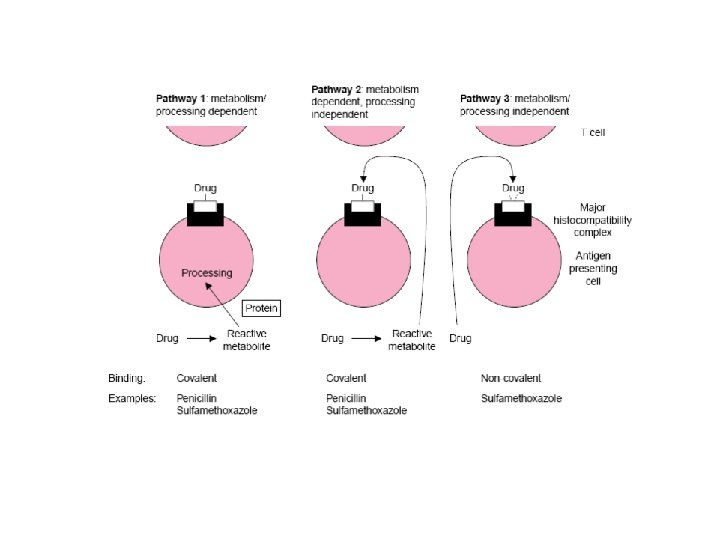 “HAPTEN HYPOTHESIS” (ipotesi dell’APTENE) In genere il sistema immunitario riconosce molecole con un peso molecolare sopra i 1000 Da. La maggior parte dei farmaci con un peso molecolare sotto i 1000 Da non dovrebbe essere immunogenico per se. La reazione di ipersensibilità è scatenata dall’interazione fra linfociti T e proteine coniugata al farmaco, che avviene su complesso maggiore di istocompatibilità (major histocompatibility complex (MHC), human leucocyte antigen (HLA)) di cellule presentantigeni. E’ necessario comunque che ci siano gli appropriati segnali di costimolazione / stimolazione del sistema immunitario.