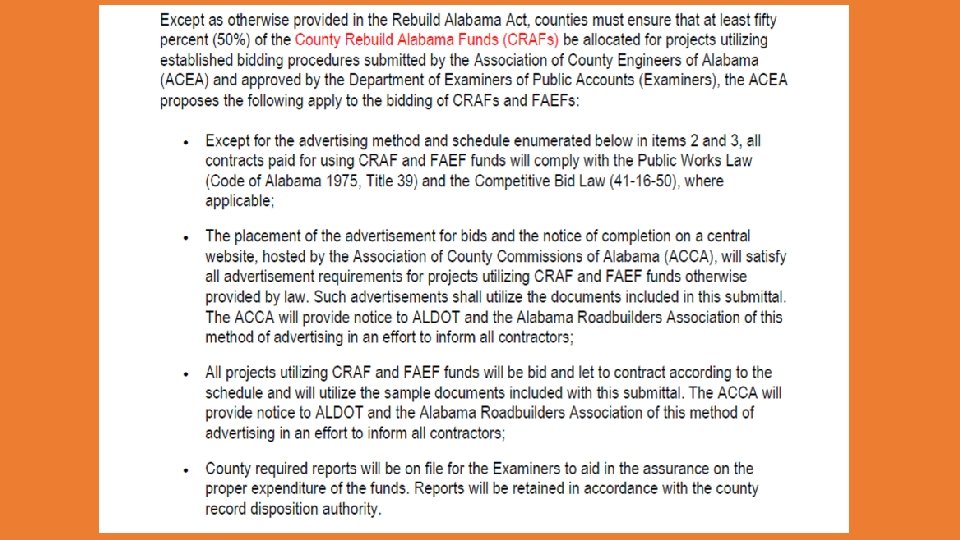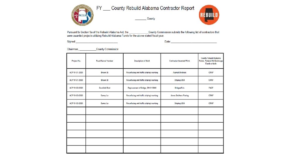 County Rebuild Alabama Bid Guidance Advertisement for Proposal ________ County is taking sealed bids for labor, equipment, materials, and any incidentals required to complete the work required for the (ENTER BID DESCRIPTION HERE) of the County. This bid is intended to comply with the Rebuild Alabama Act, No. 2019 -2, and Alabama Code Title 39, the Alabama Public Works Law. Bidders shall be required to comply with the provisions of the Rebuild Alabama Act, No. 2019 -2 and Title 39 of the Alabama Code regardless if the requirement is explicitly detailed in the bid proposal or not. Sealed bids will be received by the ______ County Commission at _____________________________ until _____ AM Central Time on _________, and then publicly opened as soon thereafter as practicable. Award will be made at the next regularly scheduled meeting of the ______ County Commission.