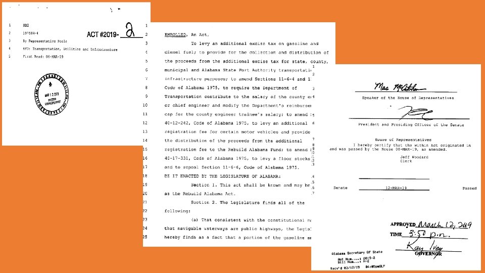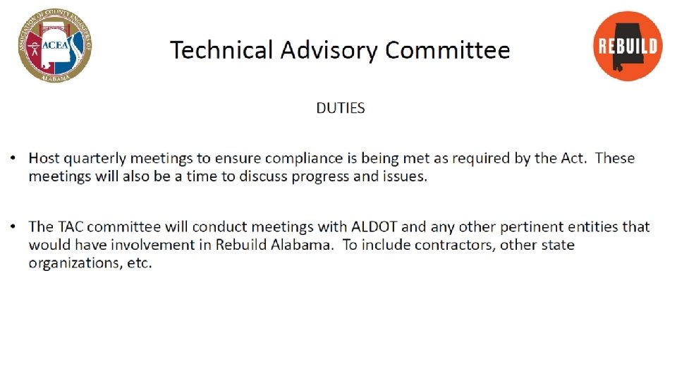 Rebuild Alabama Implementation Team Technical Team Shelby Morgan Marshall Mobile Elmore Chambers Randy Cole Greg Bodley Bob Pirando Ricky Mitchell Richard Spraggins Luke Mc. Ginty Josh Harvill Policy/ Accountability Team Crenshaw Autauga Geneva Perry Elmore Benjie Sanders John Mark Davis Justin Barfield Deandre Kimbrough Richie Beyer