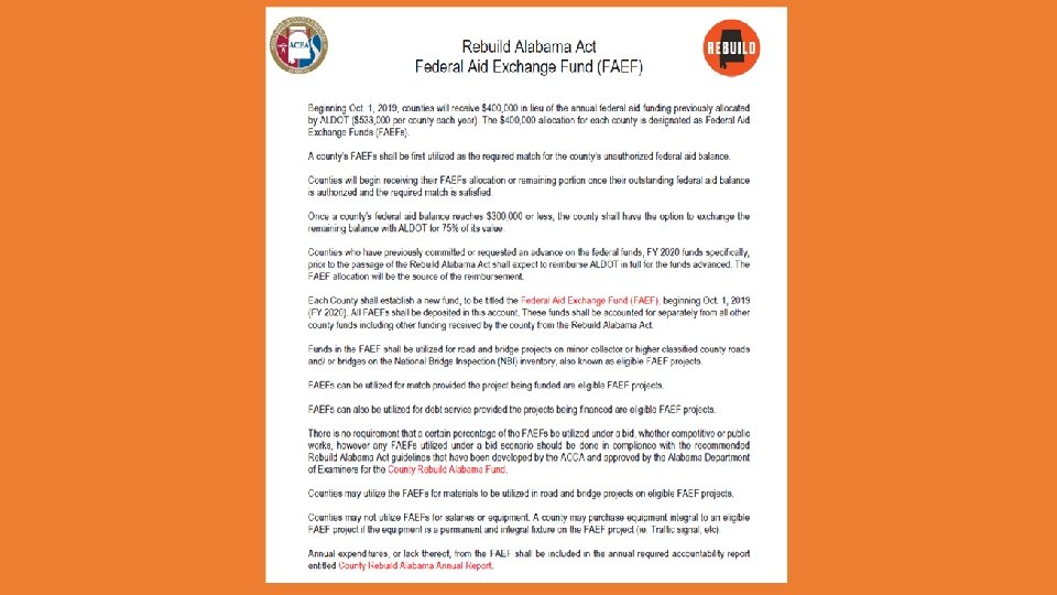 Federal Aid Exchange Fund (FAEF) Beginning Oct. 1, 2019, counties will receive $400, 000 in lieu of the annual federal aid funding previously allocated by ALDOT ($533, 000 per county each year). The $400, 000 allocation for each county is designated as Federal Aid Exchange Funds (FAEFs). A county’s FAEFs shall be first utilized as the required match for the county’s unauthorized federal aid balance. Counties will begin receiving their FAEFs allocation or remaining portion once their outstanding federal aid balance is authorized and the required match is satisfied.