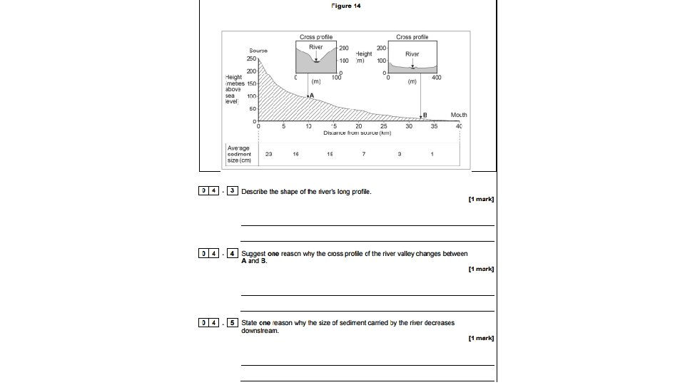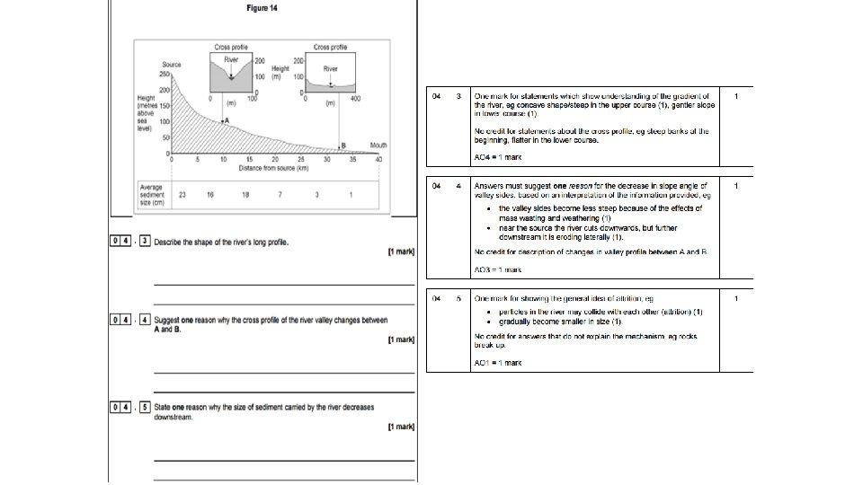 WILF: • Adjectives • Data • Comparison/manipulations Title: Ability to DESCRIBE: Describe changes in the river and valley cross profiles downstream Cross profile of the river VALLEY Cross profile of the river CHANNEL Changes in the river’s LOAD The River valley becomes flatter and wider. In the upper course there is a V-shaped valley with steep sides and no flood plain. The depth of a valley may be 200 m deep. In the lower course the river valley is over 50 times wider, extending to 100 km but is shallower (just 5 m). The river channel becomes wider and deeper. In the upper course the channel is narrow- just a few metres wide, and shallow- less than 1 m deep. In contrast the channel in the lower course is much deeper (over 5 m deep) and significantly wider- 75 m this is almost 20 times wider. rivers load becomes …………… and more ………………. downstream The