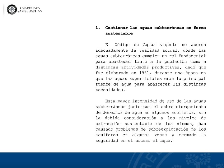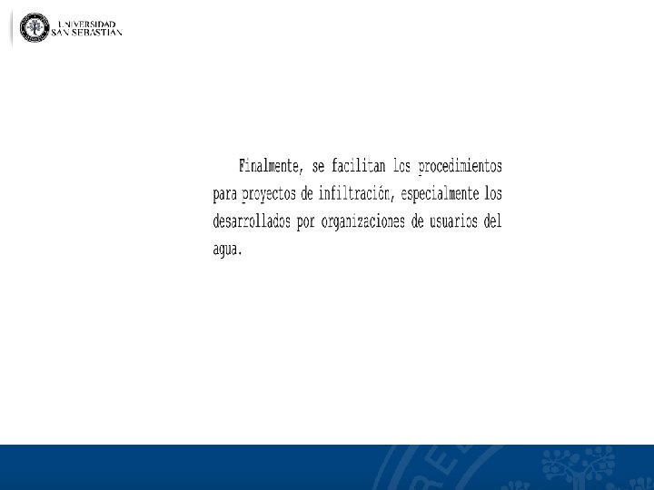 Observaciones a la propuesta • Nuevamente, se observa que el incentivo y el beneficio es sólo privado (no se considera un factor de recarga) • Se prohíbe la posibilidad de infiltrar aguas lluvias en zonas urbanas. Ello es correcto si se trata de constituir nuevos DAA, puesto que se trata de recarga natural, pero debiera incentivarse su recarga sin fines extractivos. Ej, zonas saturadas. • Si la recarga es de fuente ajena a la Cuenca (del mar, aguas tratadas o de relaves. . . ) ¿Cuál será la medida de aquellos nuevos derechos? Nuevamente, no se consideró un margen mínimo para el medio ambiente. • Objetivo de la recarga: aumentar la disponibilidad para los titulares existentes o para constituir nuevos derechos ¿Mejorar la sustentabilidad de los acuíferos? ¿Rellenar terrenos deprimidos? ¿Asegurar demanda futura? • ¿El incentivo medioambiental declarado?