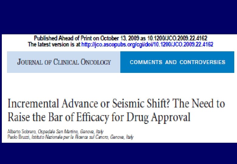 New generation of efficacy trials in rare cancers – Uncontrolled efficacy (phase II-III) trials of high quality – Randomized activity (Phase II) trials followed by uncontrolled efficacy trials (with historical controls) – RCT’s with surrogate endpoints – Adaptive, Bayesian, activity/efficacy RCT’s