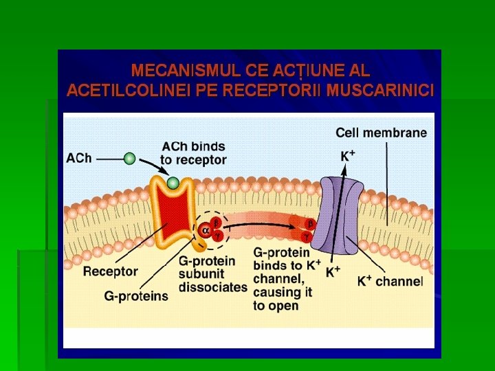 Receptorii pentru Ach de tip muscarinic § Ach utilizează două tipuri de recpetori: nitonici, sensibili la nicotina şi muscarinici sensibili la muscarină § Cei de tip nicotinic mediază actiunile Ach la nivelul joncţiunilor n-m, fiind implicati în contracţia muschilor striati § Cei muscarinici de tip M 1, M 2 şi M 3 aparţin familiei de R cu 7 segmente helicoidale transmembranare § Au rol în transmiterea interneuronală a mesajelor, contractia muschilor netezi, secretia endocrina si exocrina a unor glande