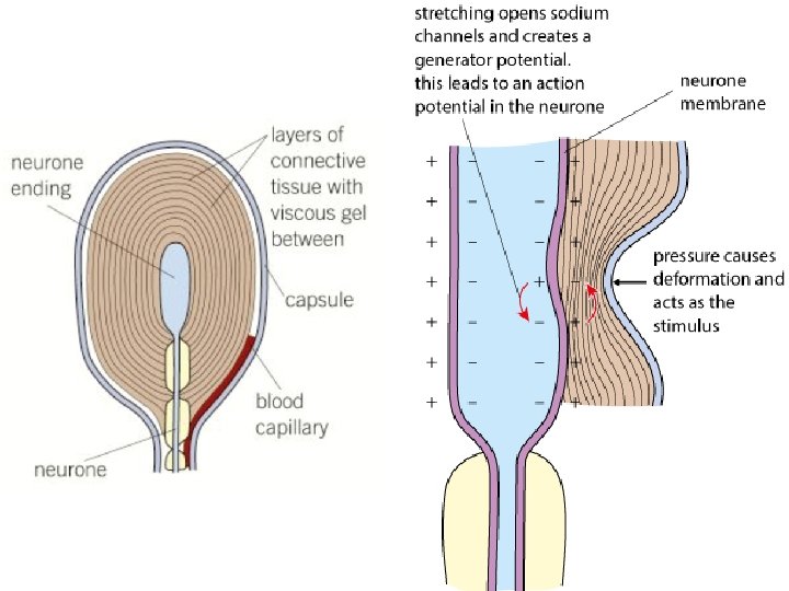 How does it work? • In normal resting state stretch-mediated sodium channels are too narrow to allow Na+ to enter – resting potential • Pressure is applied to the corpuscle and the membrane around the neurone becomes stretched • This widens the sodium channels and Na+ ions diffuse in • This changes the potential of the membrane (depolarised) – produces a generator potential • This creates an action potential that passes along the neurone