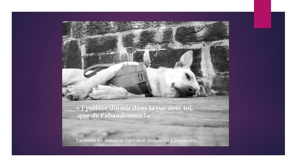 Actions expérimentées par le groupe « J’autorise les chiens dans mon immeuble à logements, j’aide un jeune à s’épanouir hors de la rue » � À l’été 2013 : Pétition afin d’invalider les clauses de baux résidentiels qui interdisent les animaux � Les participantes ont décidé de s’y associer en faisant un projet photos : � Distribution de 400 photos � Rencontre de 10 administrateurs � 60 partages sur les médias sociaux