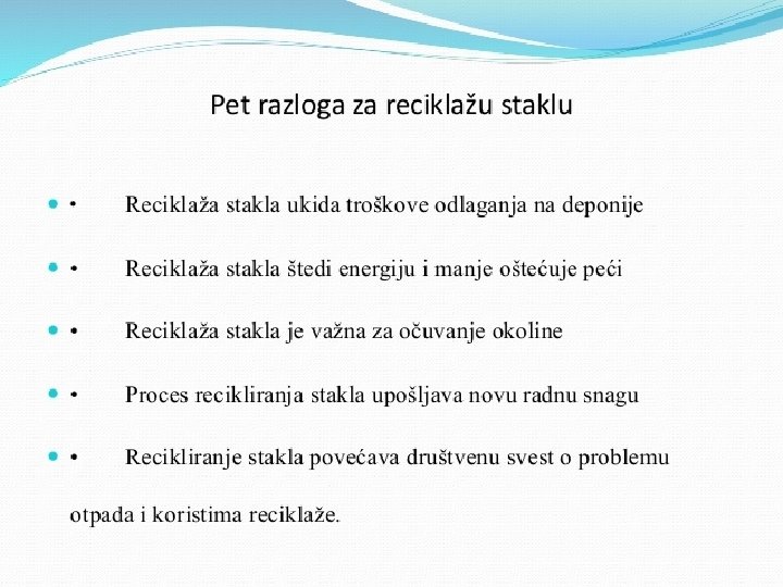 ◦ Recikliranje stakla ukljucuje sledece operacije: o Prikupljeno staklo se razvrstava sa gomile na bezbojno, braon I zeleno staklo o Staklo se prevozi do postrojenja za obradu, gde se metalni zatvaraci I plasticni delovi I skidaju I odtranjuju necistoce koje mogu uticati na kvalitet o Staklo se zatim usitnjava, te je posle toga spremno za transport do fabrike stakla o U fabrici stakla usitnjeno staklo (srca) se mesa sa sirovinom za izradu stakla (pesak, krecnjak I natrijum- karbonat) o Od istopljenog stakla prave se nove boce I tegle