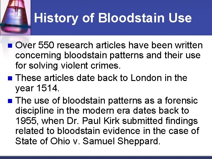 History of Bloodstain Use Over 550 research articles have been written concerning bloodstain patterns and their use for solving violent crimes. n These articles date back to London in the year 1514. n The use of bloodstain patterns as a forensic discipline in the modern era dates back to 1955, when Dr. Paul Kirk submitted findings related to bloodstain evidence in the case of State of Ohio v. Samuel Sheppard. n
