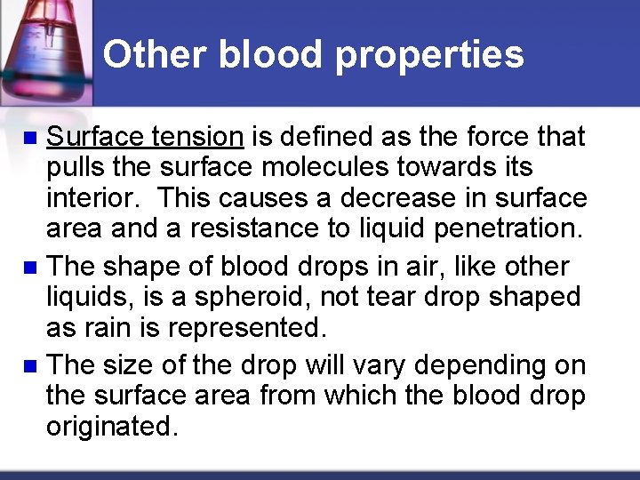 Other blood properties Surface tension is defined as the force that pulls the surface molecules towards its interior. This causes a decrease in surface area and a resistance to liquid penetration. n The shape of blood drops in air, like other liquids, is a spheroid, not tear drop shaped as rain is represented. n The size of the drop will vary depending on the surface area from which the blood drop originated. n