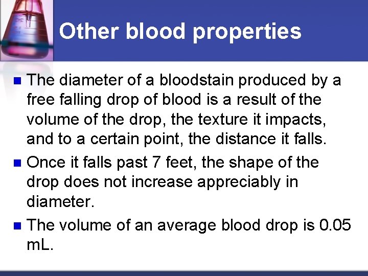 Other blood properties The diameter of a bloodstain produced by a free falling drop of blood is a result of the volume of the drop, the texture it impacts, and to a certain point, the distance it falls. n Once it falls past 7 feet, the shape of the drop does not increase appreciably in diameter. n The volume of an average blood drop is 0. 05 m. L. n