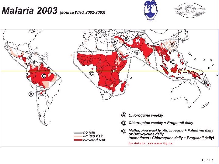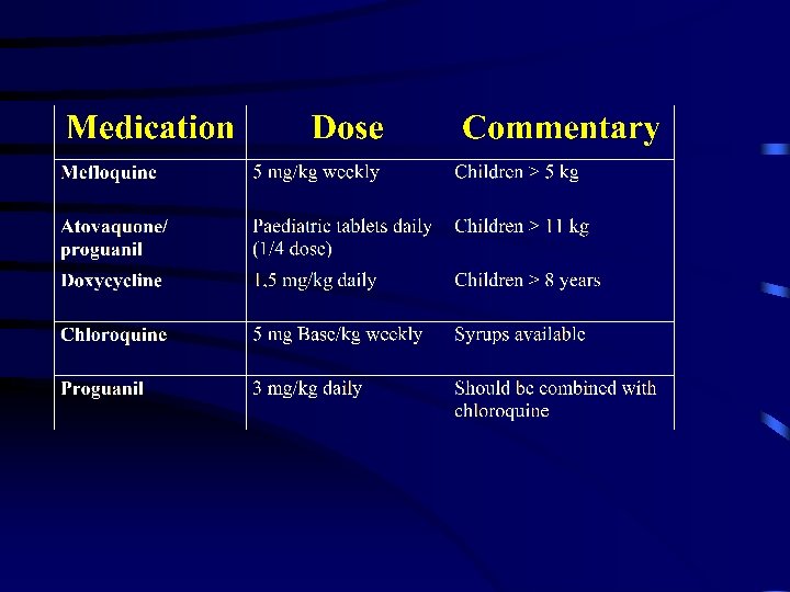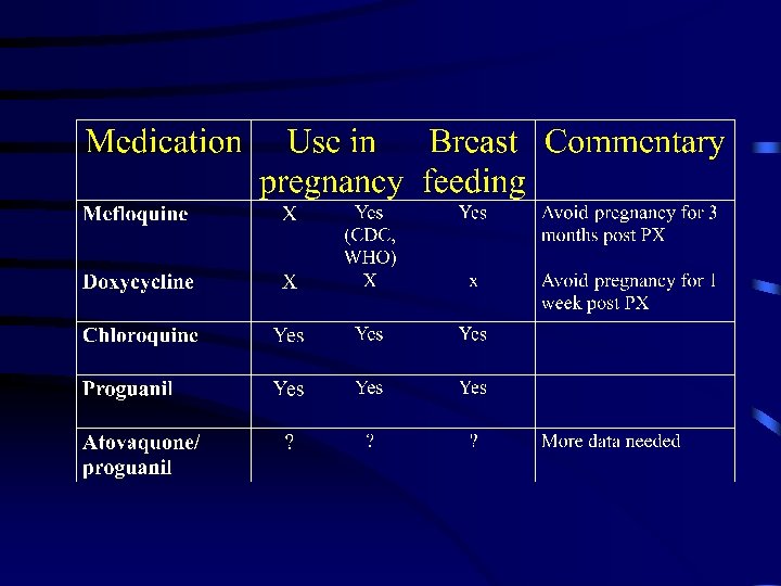 Chemoprophylaxis palette - 2003 • • Mefloquine - 250 mg weekly Atovaquone/proguanil - 250 mg/100 mg daily Doxycycline - 100 mg daily Chloroquine - 300 mg base daily (often with proguanil 200 mg daily) • Primaquine 30 mg base daily • ? Tafenoquine future option-dose finding 50/100/200 mg week