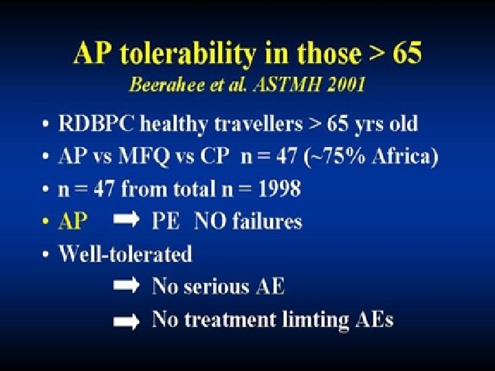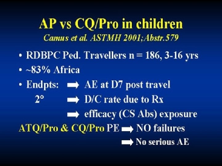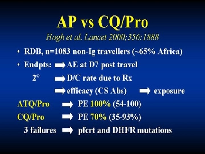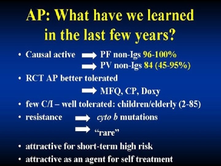 PI efficacy reports • Mefloquine (93 -100 % efficacy) Croft 2001 systematic review of RCTs • Doxycycline (92 -100 %) Kain 2001 review of studies • Atovaquone/proguanil (92 -100 %) Efficacy in semi-immune persons in Africa and in travelers. Resistance mainly due to cytochrome b gene mutations Färnert et al. BMJ 2003