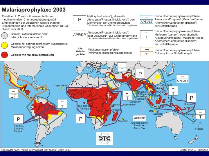 Mefloquine 2003 PROs • Efficacy > 95 % (all species) • Wide experience • Weekly dosing • Suitable for children, pregnant, long-term • Reasonable price • Rare serious events CONs • Negative medianeuropsychological • Areas of Pf resistance • Interactions • Contraindicated in depression, epilepsy and psychoses • Arythmia (ß-, Ca++, DIG, quinid)
