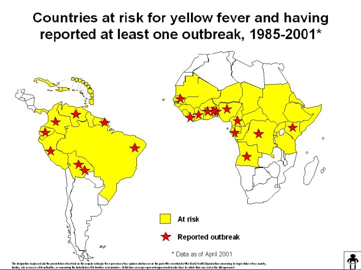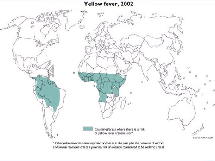 Risk of yellow fever : Africa Maximum risk July-Oktober 2 weeks stay Illness Death Epidemics Interepidemics 1: 250 1: 2, 000 1: 1, 300 1: 10, 000 Montah and Cetron CID 2002, 34: 1369