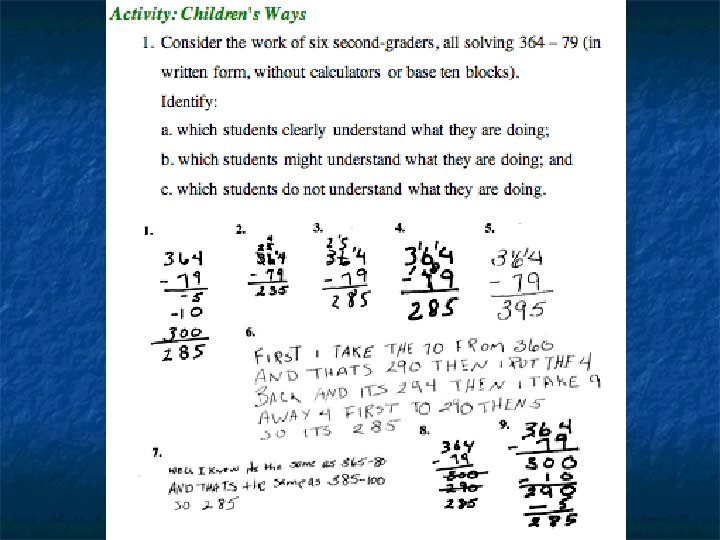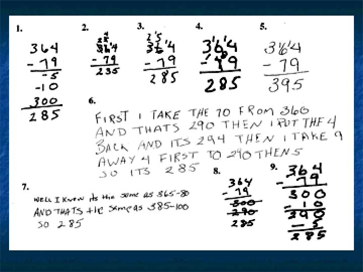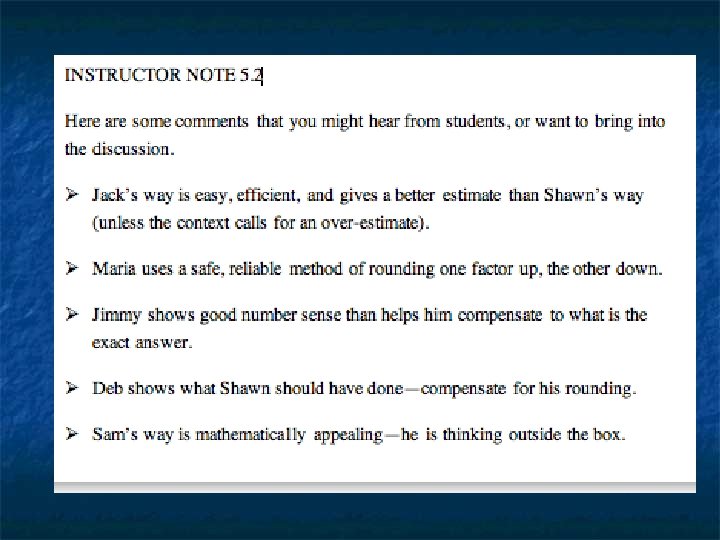 Key Ideas in Reasoning About Numbers 1. Our numeration system can be understood only if the significant role of place value is recognized. 2. Different generic contexts can be modeled by arithmetic operations, and hence there are different ways of thinking about these operations. 3. *Student-invented nonstandard algorithms can be used to help them understand traditional algorithms. 4. *Mental computation, estimation, paper-and-pencil calculations, and calculators are appropriate at different times. 5. Facility in changing easily from one number representation to another is fundamental to having good number sense. 6. The mathematics underlying algorithms for operating on whole numbers and on rational numbers can and should be understood.