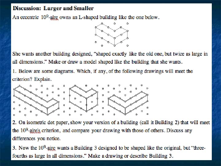 Key Ideas regarding Shapes Beginning with a study of 3 -dimensional shapes provides an entrance into unfamiliar shapes that motivate the study of geometry. Considering faces of polyhedra leads to a study of polygons. *Exploring 3 -dimensional shapes allows learning about spatial visualization and ways to practice it. Shapes can be classified, giving rise to hierarchies. Students must understand appreciate definitions of shapes and their names. *Size changes in planar and space figures require understanding similarity (based on proportional reasoning). The use of a scale factor in determining size change leads to viewing size change as a multiplicative relationship. Shapes, both 2 - and 3 -dimensional, may have symmetries of different types. Rigid motions (isometries) include translations, reflections, rotations, and glide reflections. The figure that results from a rigid motion is congruent to the original figure.