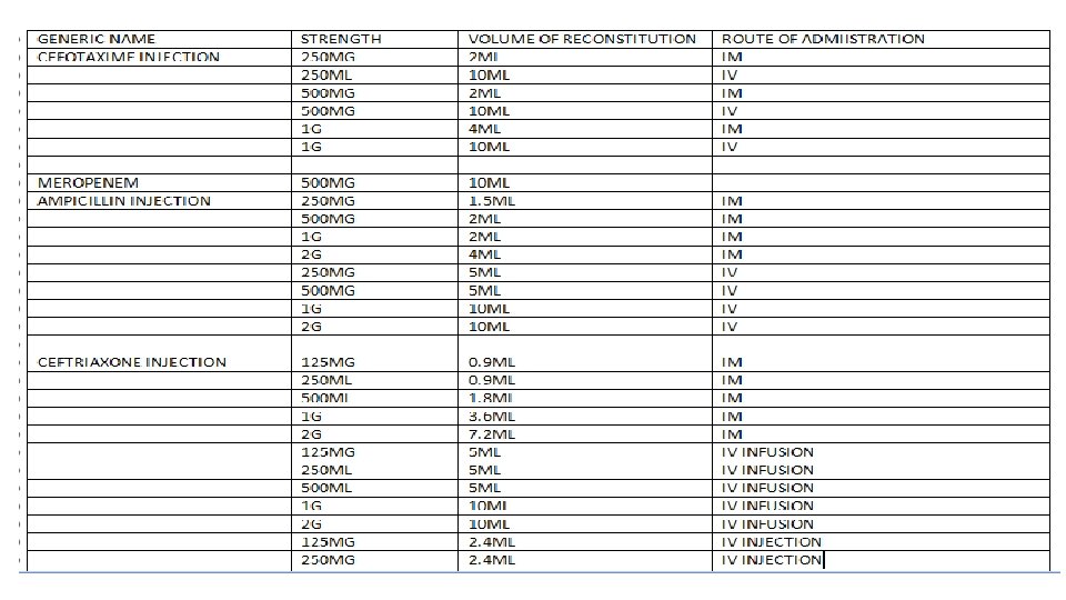 Meropenem Injection • Meropenem for Injection to be used for bolus intravenous injection should be constituted with sterile Water for Injection (10 m. L per 500 mg Meropenem). • This provides an approximate available concentration of 50 mg/m. L. • Reconstituted solutions are both clear and colourless to pale yellow