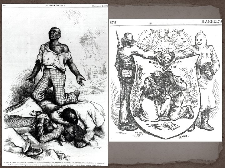 Southern Backlash � Ku Klux Klan �“protect whites from radical ex-slaves” by destroying Republican Party (leaders and supporters) �KKK Acts and Enforcement Acts