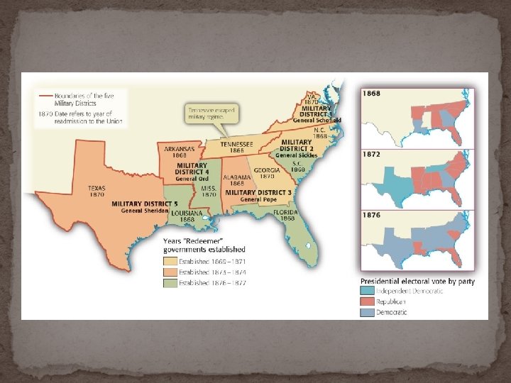 The Decline of Reconstruction cont. �The Midterm election in 1874 and Redeemer Movement �Northerners tire of “Southern problem” �The Election of 1876 �The Compromise of 1877