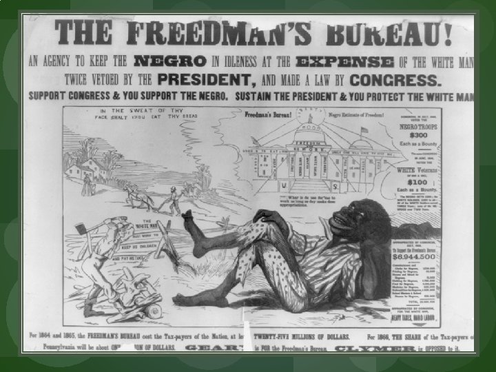 Northern Vision for the South The Freedmen’s Bureau (1865 -1870) q Congressional Act q Responsible for social policy q Establish schools q Provide aid to the poor q Settle disputes between white and blacks Bureau agent as a promoter of racial peace in the violent South