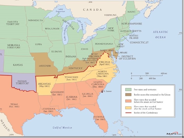 1. Can Slavery Expand? ? -Lincoln NO!!!! -South YES!!! 2. South Good Early (Better Generals & Morale) 3. North has more factories, railroads and men 4. North Turns Tide: General Grant & Sherman -Grant throws men and material at Lee over & over -Sherman cuts south in half with March to Sea 5. Lee Surrenders. . . 1865 (South out of EVERYTHING. . Men, supplies, & will to fight)