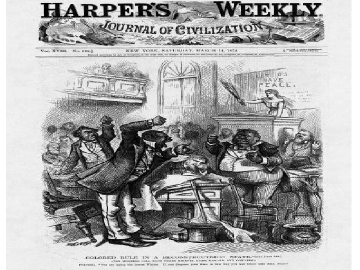 Document D Source: Heather Cox Richardson, The Death of Reconstruction: Race, Labor and Politics in the Post-Civil War North, 1865 -1901. Harvard University Press, Cambridge, Massachusetts, 2001. In the fall of 1873, even the staunchly (firmly) pro-Grant and pro-Freedman Boston Evening Transcript ran a letter…arguing that blacks, as a people, are unfitted for the proper exercise of political duties…The rising generation of…blacks needed a period of probation and instruction; a period…long enough for the black to have forgotten something of his condition as a slave and learned much of the true method of gaining honorable subsistence and of performing the duties of any position to which he might aspire. ” Northern artist’s portrayal of the South Carolina State Legislature during Reconstruction. Source: The cover of Harper’s Weekly, March 14, 1874