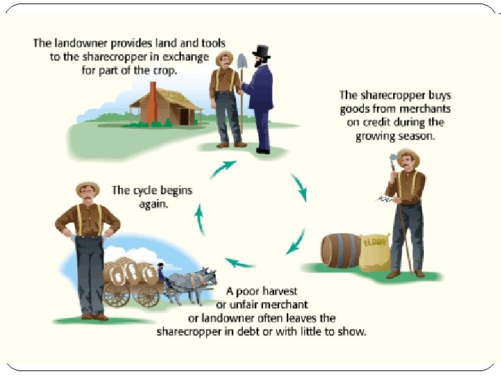 Sharecropping �System of farming practiced where both blacks and whites on a farm share the crops. Landowner would supply the land tools while the sharecropper provided the labor and purchased their supplies. When the crop was sold it would be split between the two but not always equally. Landowners kept the power over the former slaves by keeping them in debt and not letting them leave.
