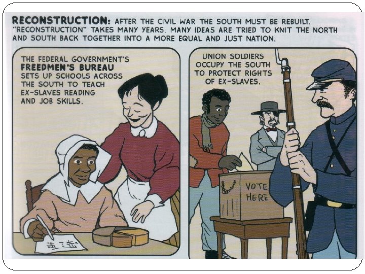 Freedmen’s Bureau �Task of feeding and clothing former slaves �Find work for them �Negotiate labor contracts �Began education