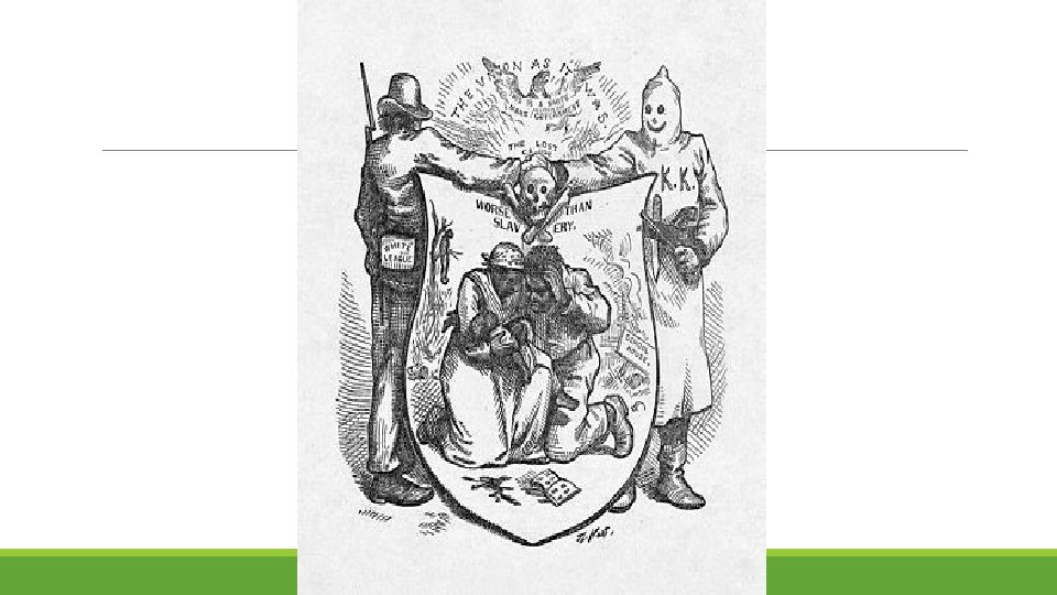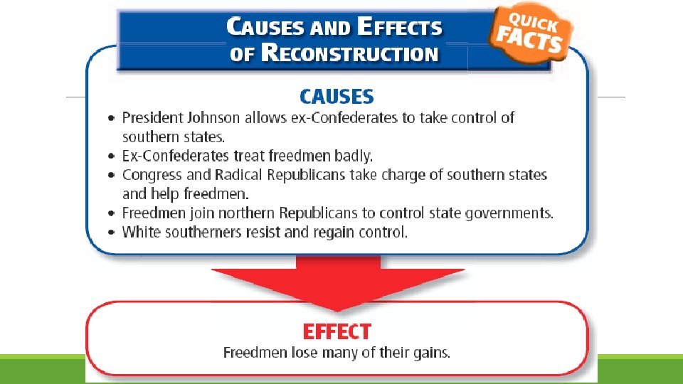 Freedmen’s Bureau Sought to help freed slaves ◦ Created schools ◦ Encouraged voting rights ◦ A few Confederate states elected black leaders Scalawags Southerners who supported Reconstruction Carpetbaggers Northerners who moved South to profit from Reconstruction